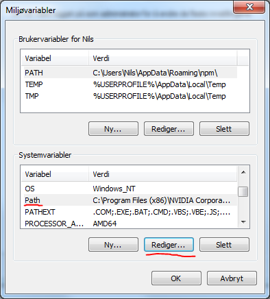 Trykk på miljøvariabler. I vinduet som dukker opp må du du finne "Path" i systemvariabler. Velg denne og trykk rediger.