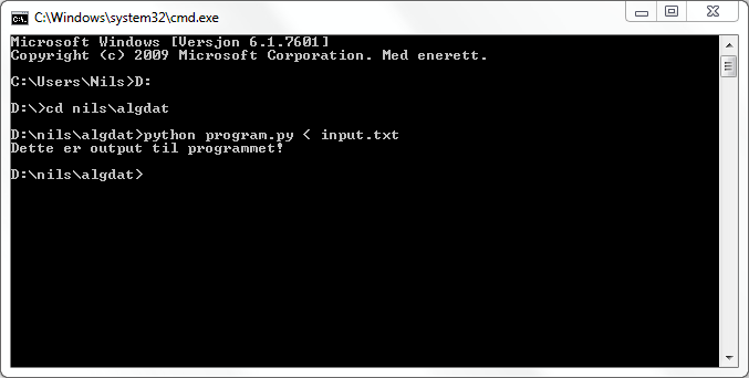 Anta at du har programmet ditt (program.py) og en inputfil (input.txt) du ønsker å teste programmet ditt på. Begge filene er lagret i mappen D:\nils\algdat. Åpne cmd (åpne startmenyen, skriv cmd og trykk enter) og tast følgende: